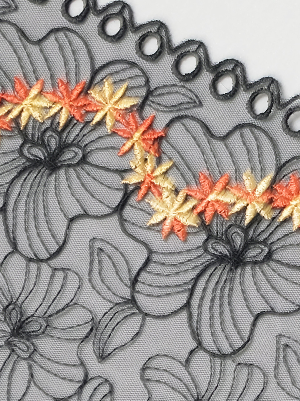 This lace is a beautiful black embroidered flower mesh with yellow and orange flower design. It also have open embroidered eyelets so you can tread thin ribbon through the scallop edge. It is so wide enough to work most bra patterns into. This lace is unilateral but has a balanced design, so you can get an even left and right side. Laces are sold by the metre unless stated otherwise. Kindly note that the laces have joins throughout the rolls, so if ordering larger quantites, you may have a join/s. Laces are non returnable as they are specifically cut for your order.