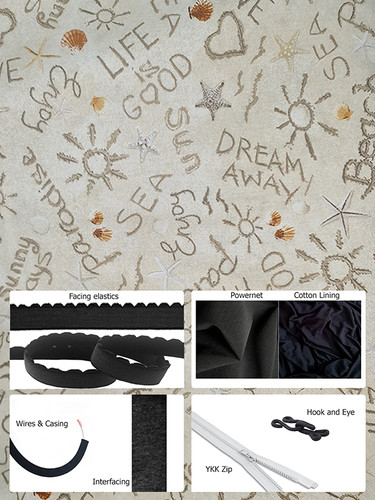 Back fabric - Powernet, cotton woven cup fabric, baby combed cotton jersey lining fabric, band facing elastic, underarm/shoulder/bust facing elastic, underwire casing, wires, YKK front opening zip (12cm for sizes 28 - 36 and 17cm for sizes 38 - 54), interfacing strip, hook and eye.