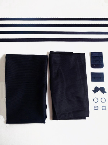Powernet or Lycra for the back fabric, Tricot cup fabric and lining for the lower cups and frame, facing elastics for the band and underarm, shoulder strap elastic, underwire casing, hook and eye tab, rings and slides, bow motif.