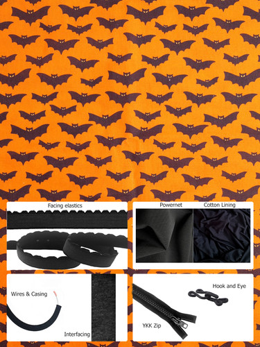 Back fabric - Powernet, cotton woven cup fabric, baby combed cotton jersey lining fabric, band facing elastic, underarm/shoulder/bust facing elastic, underwire casing, wires, YKK front opening zip (12cm for sizes 28 - 36 and 17cm for sizes 38 - 54), interfacing strip, hook and eye.