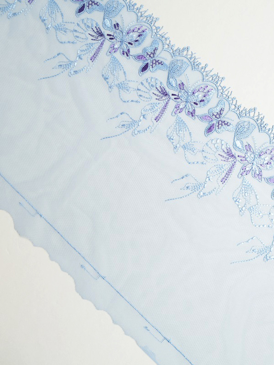 This soft embroidered mesh lace has a sweet butterfly embroidered eyelash edge pattern in a stunning blue colour. The majority of this lace is mesh, and it is a strong and supportive lace, perfect for bra, lingerie and camisole making. As it is a wide profile it is suitable for large busts. Laces are sold by the metre unless stated otherwise. Kindly note that the laces have joins throughout the rolls, so if ordering larger quantites, you may have a join/s. Laces are non returnable as they are specifically cut for your order.