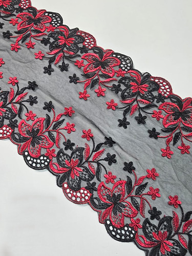 This stunning lace is a heavily embrouidered bilateral lace in ruby red and black. It also has a unique fishnet pattern in the double lace edge. Lace are sold by the metre unless stated otherwise. Kindly note that the laces have joins throughout the rolls, so if ordering larger quantites, you may have a join/s. Laces are non returnable as they are specifically cut for your order.