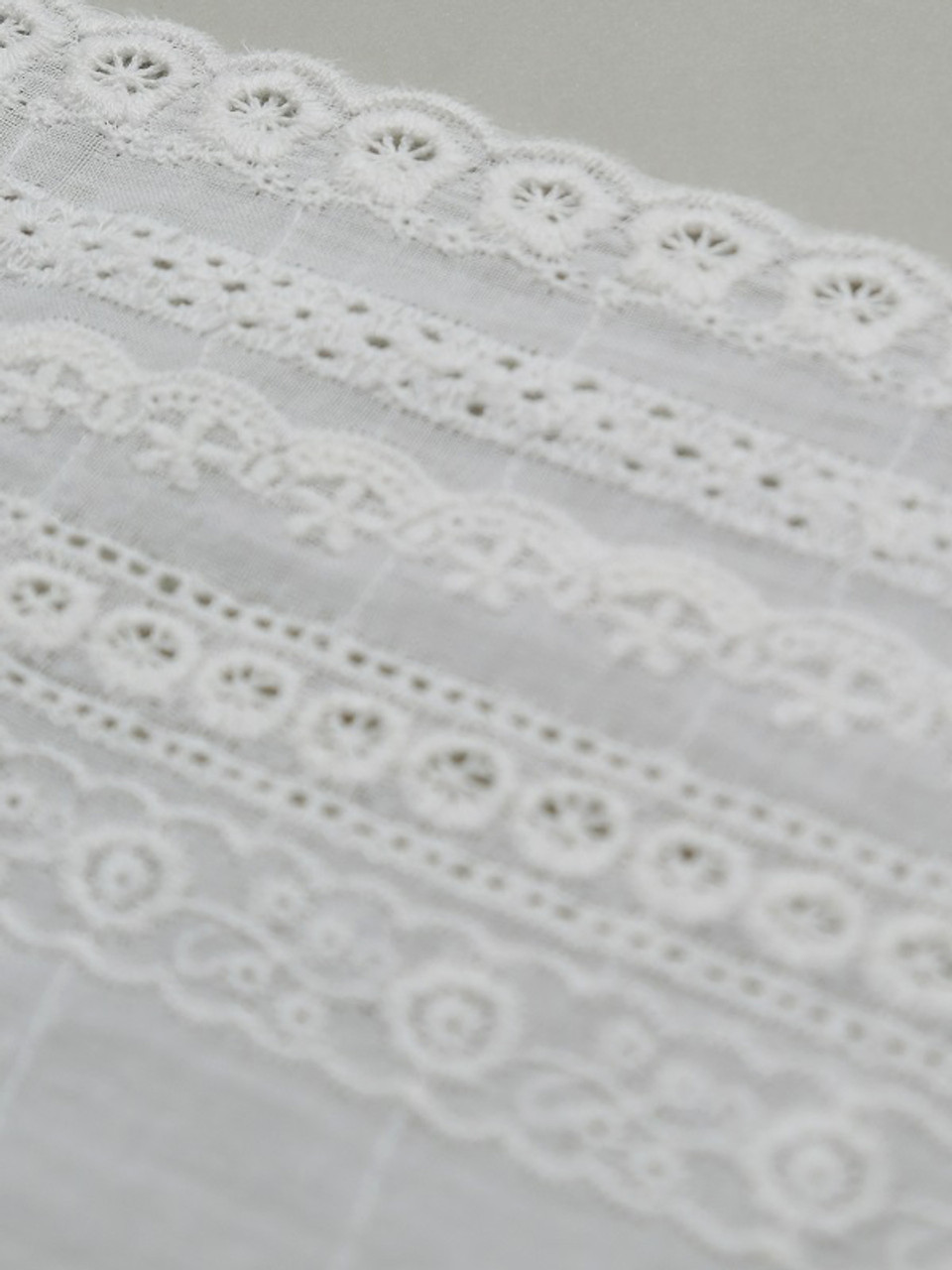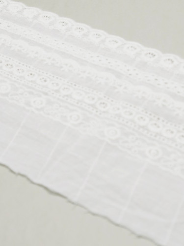 The cotton rows lace is 100% cotton with a pretty pattern throughout and a scallop lace edge. Laces are sold by the metre unless stated otherwise. Kindly note that the laces have joins throughout the rolls, so if ordering larger quantites, you may have a join/s. Laces are non returnable as they are specifically cut for your order.
