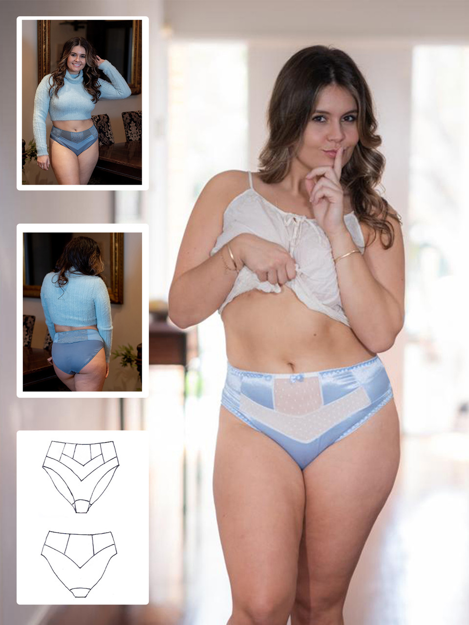 Materials Requirements Regular Size – 0.8m (on FOLD) or 0.4m (with centre seam) of stretch fabric such as Lycra, cotton Lycra, satin or lace, 0.3m of contrast stretch fabric and the same again if introducing a third fabric option, 3m of 10mm facing or lingerie elastic, 15cm x 20cm cotton for gusset, bow motif.
