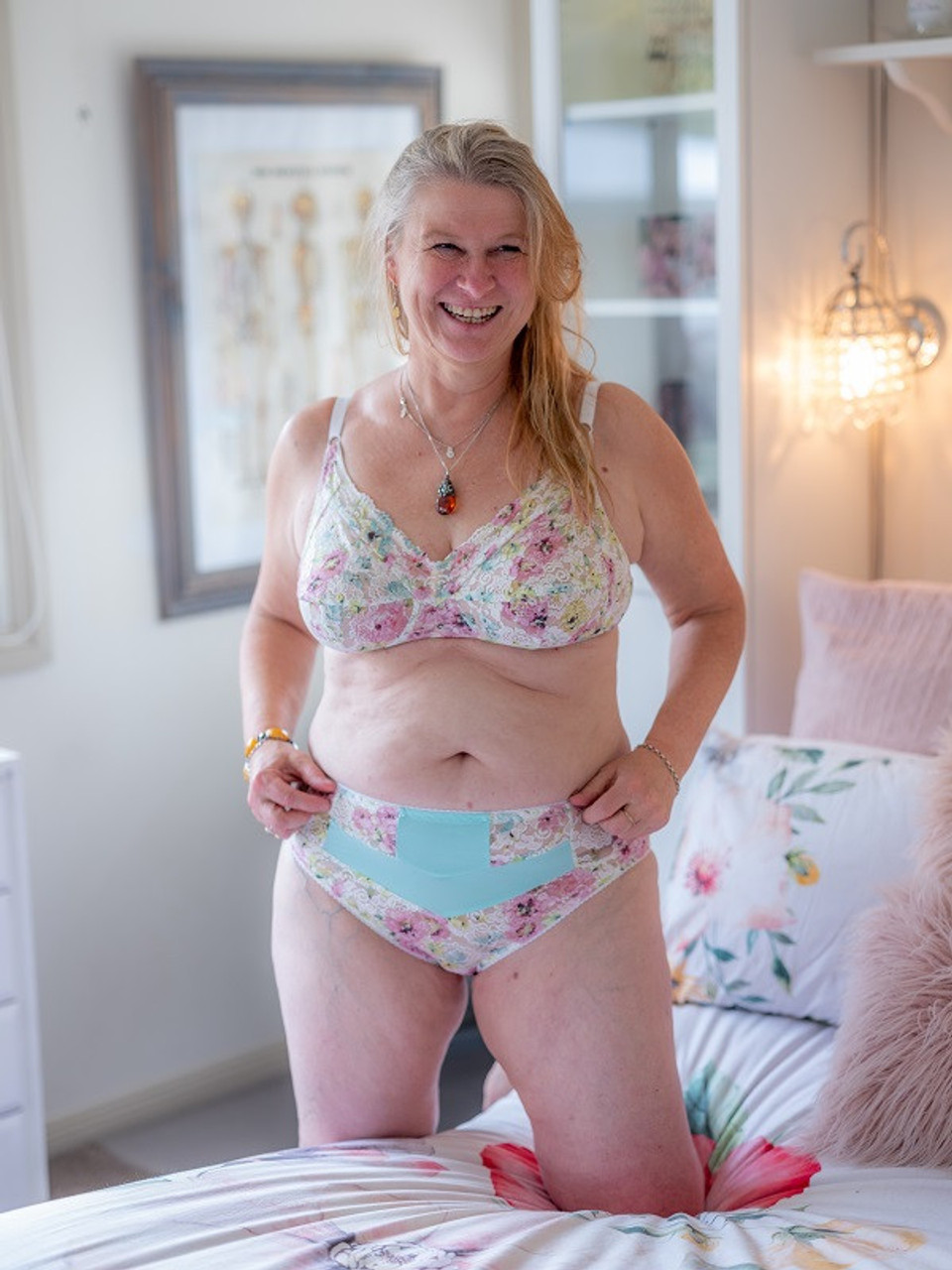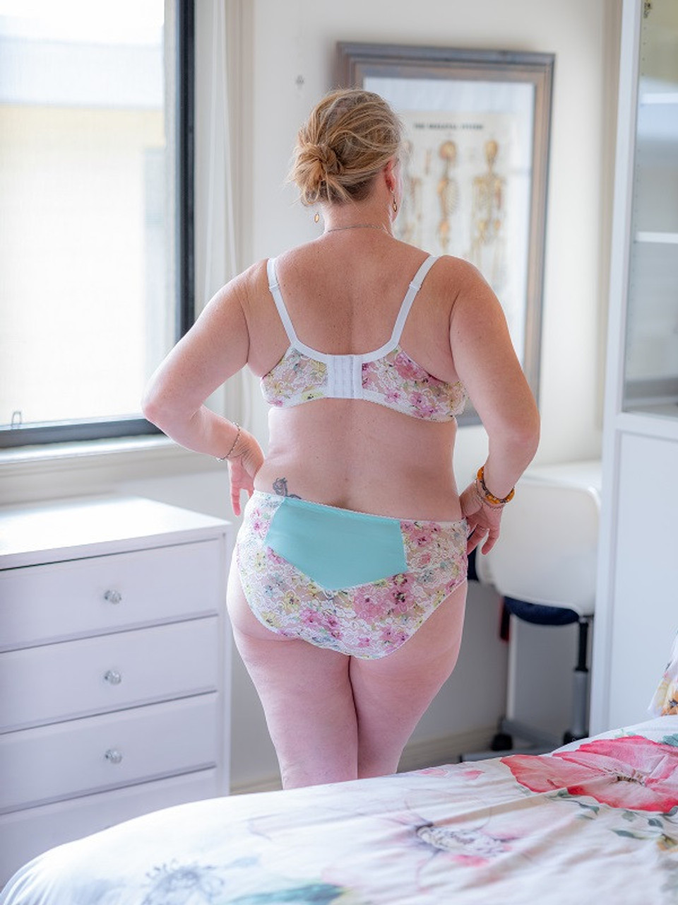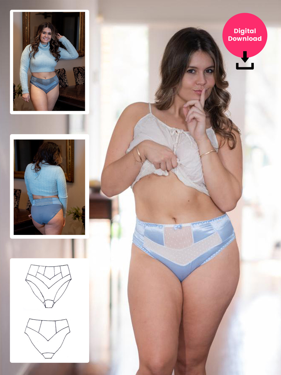 Materials Requirements – 0.8m (on FOLD) or 0.4m (with centre seam) of stretch fabric such as Lycra, cotton Lycra, satin or lace, 0.3m of contrast stretch fabric and the same again if introducing a third fabric option, 3m of 10mm facing or lingerie elastic, 15cm x 20cm cotton for gusset, bow motif.