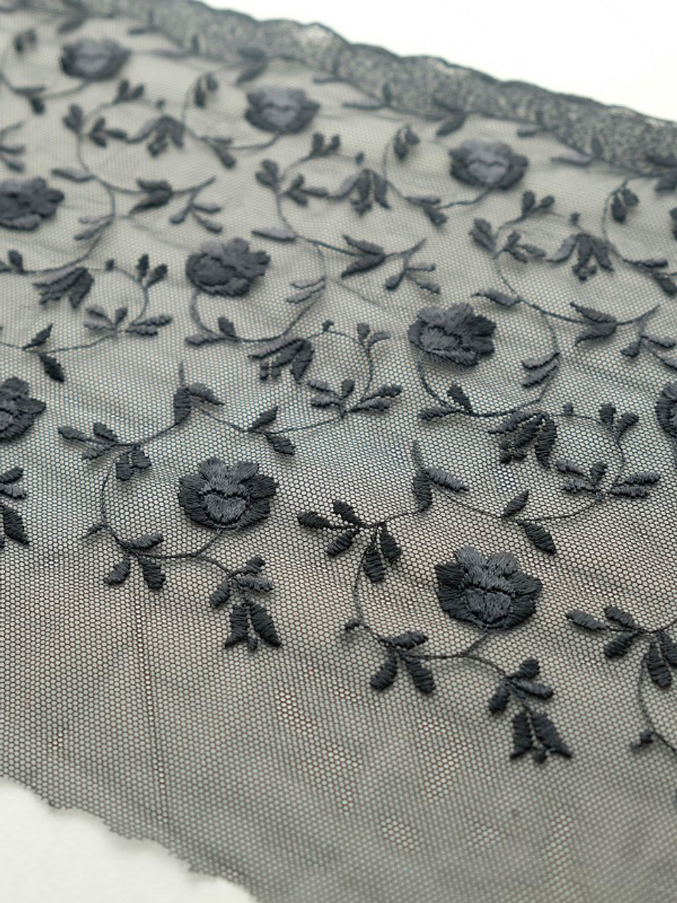 This lace has an pretty embroidered floral lace pattern, with a dark scallop edge. Laces are sold by the metre unless stated otherwise. Kindly note that the laces have joins throughout the rolls, so if ordering larger quantites, you may have a join/s. Laces are non returnable as they are specifically cut for your order.