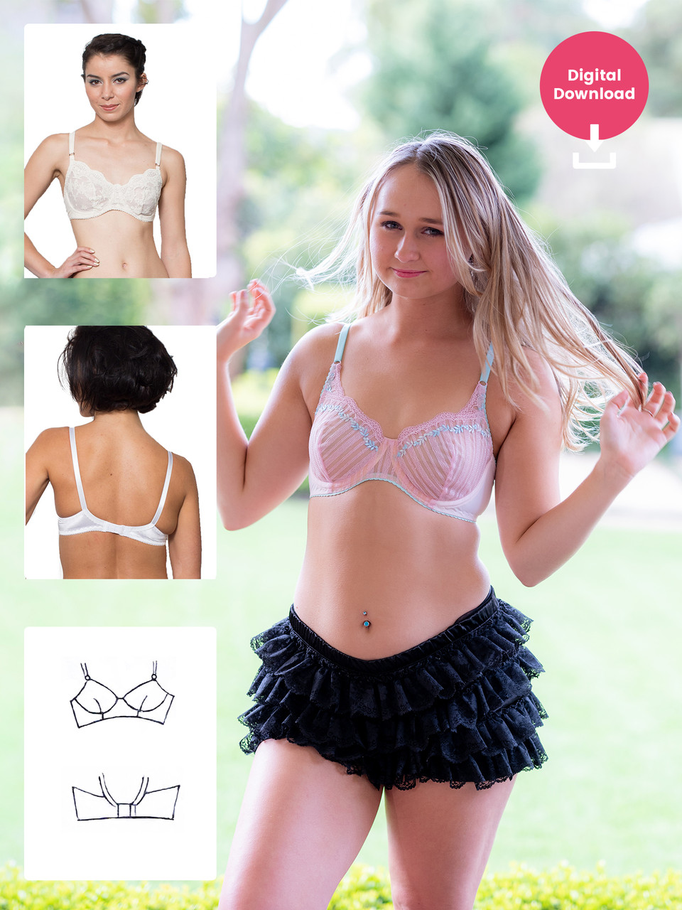 Materials needed are 1m of at least 19cm of scallop edge rigid lace, 0.4m of sheer nylon for lining, 0.4m of Powernet, 1m of strap elastic (width of choice) with matching rings and slides, 1m of 10mm facing elastic, 1m of 12mm facing elastic, 1m of 12mm underwire casing, 1 pair of underwires, 2 or 3 hook and eye tab, bow motif to finish. This pattern is the Petites size range, and comes in sizes 6, 8 & 10, cups AAA, AA and A.It is a supportive full coverage bra with a gothic arch or normal centre front and a plunging option as well. This pattern is suitable for medium experience bra & lingerie sewists.