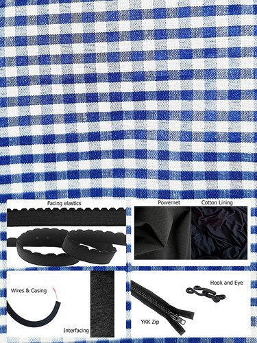 Back fabric - Powernet, polyester woven cup fabric, baby combed cotton jersey lining fabric, band facing elastic, underarm/shoulder/bust facing elastic, underwire casing, wires, YKK front opening zip (12cm for sizes 28 - 36 and 17cm for sizes 38 - 54), interfacing strip, hook and eye.