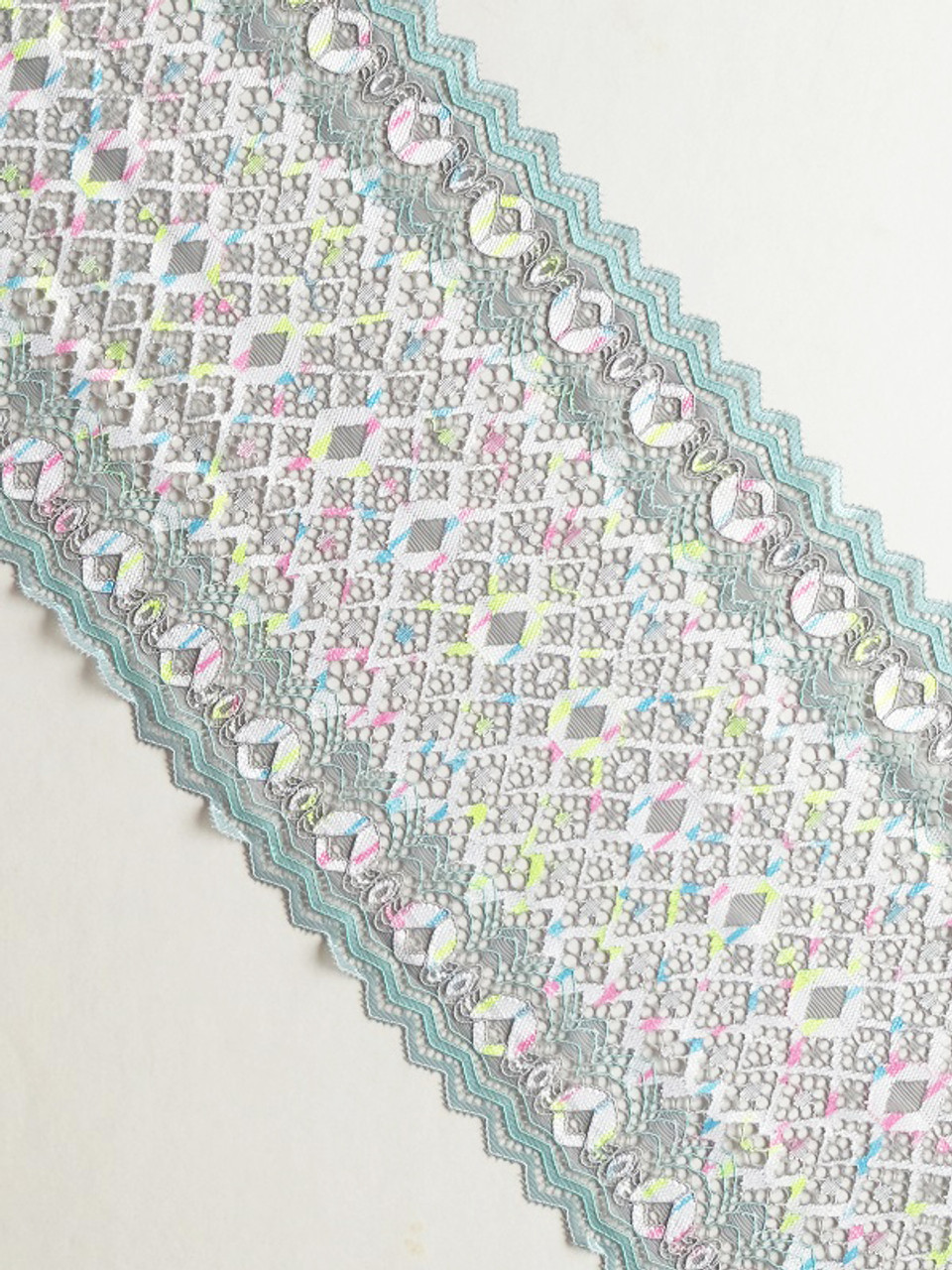 This lace is a medium-firm stretch lace in a vibrant multicoloured lace design with bilateral zig zag edges. It is nice and wide and is suitable for most patterns due to its width. Laces are sold by the metre unless stated otherwise. Kindly note that the laces have joins throughout the rolls, so if ordering larger quantites, you may have a join/s. Laces are non returnable as they are specifically cut for your order.
