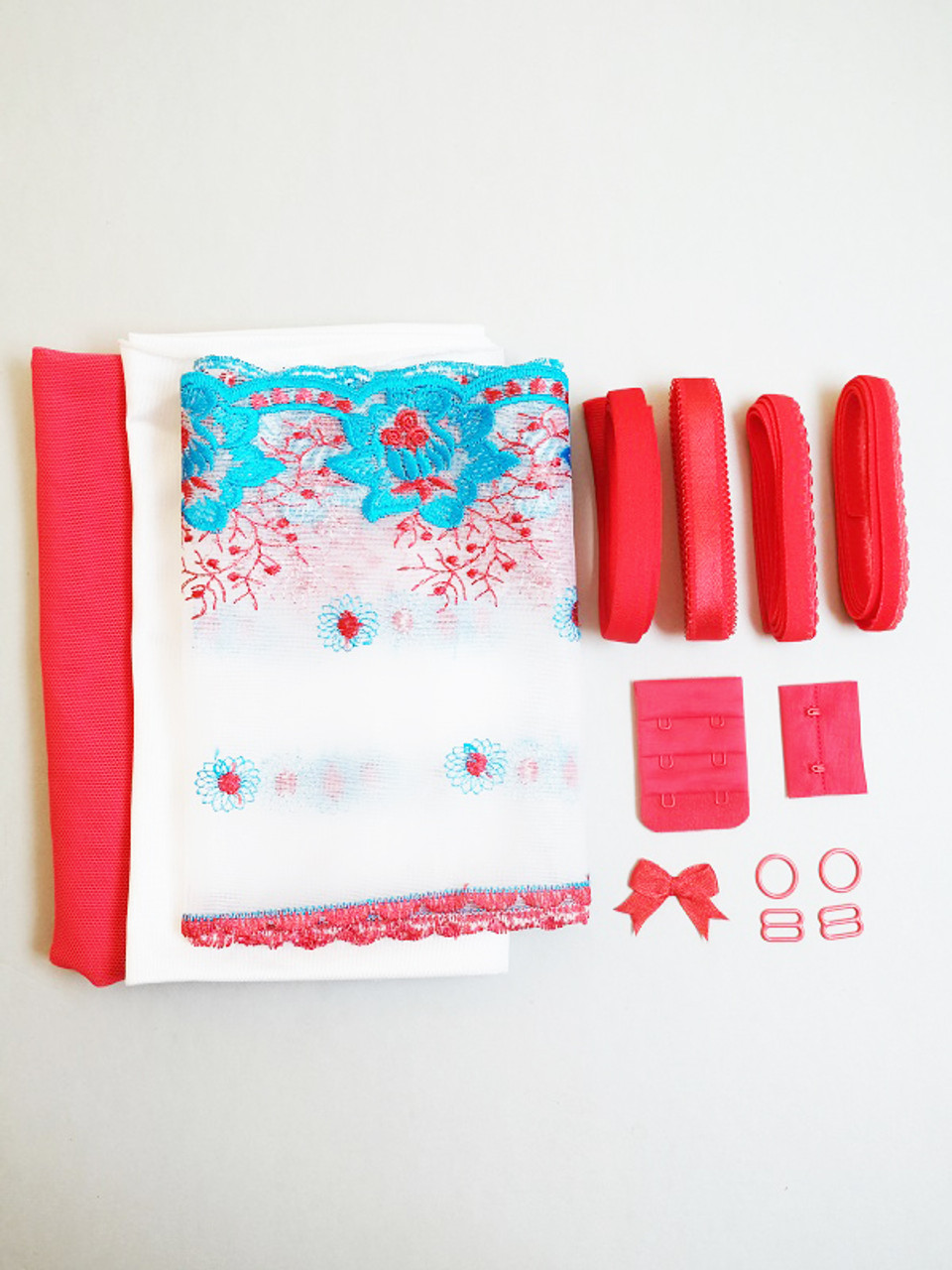 These kits are designed for use with Booby Traps BOO3, BOO2, Claudia, Vanessa, Baroque and Balconette bra patterns. Everything you need to make your own bra is included. The lace provided is for the upper cups and centre front. If desiring a wider band elastic etc you can purchase them separately here. The price will change with add-ons and also some customisations.