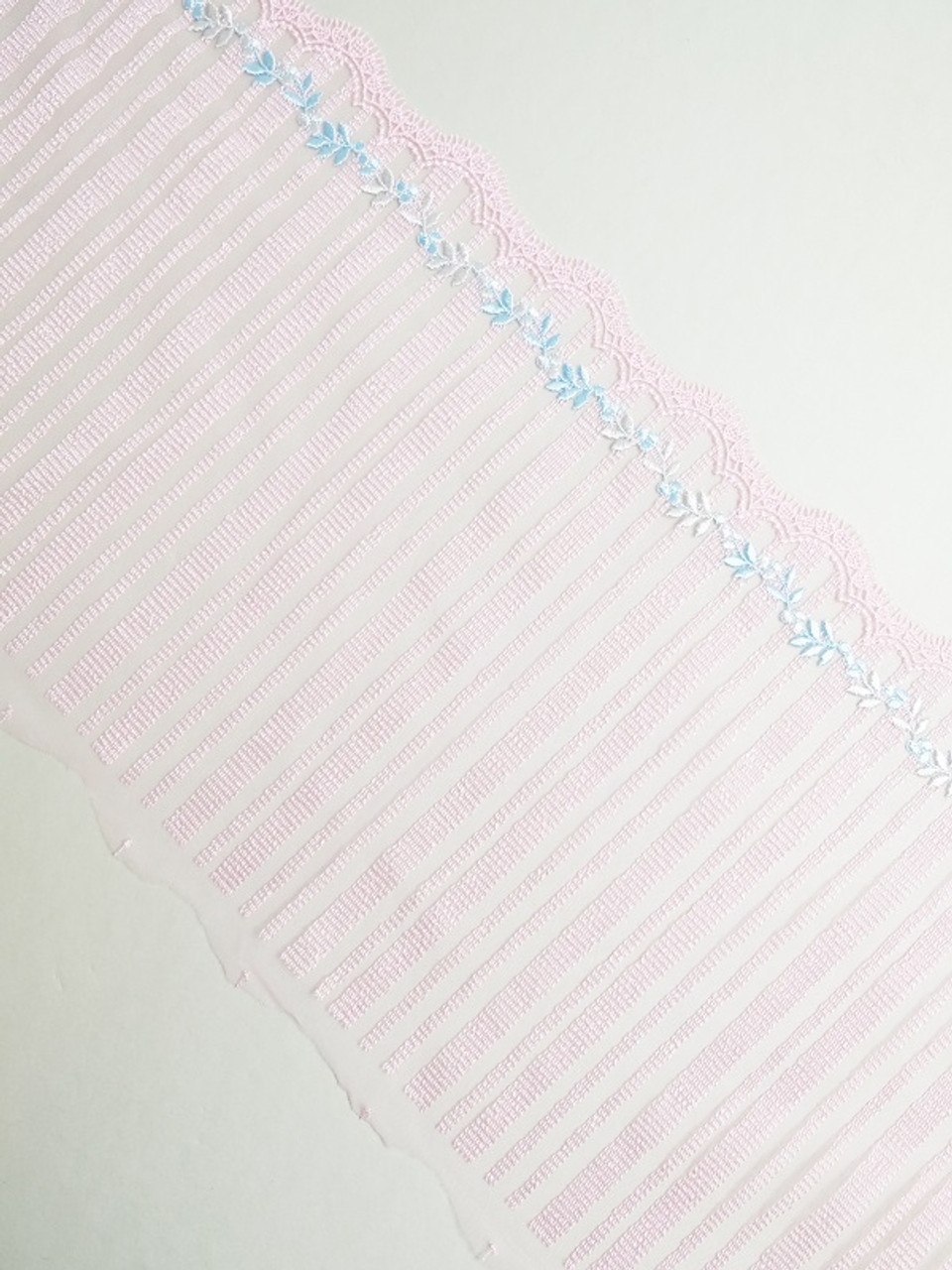 This lace is so pretty! It is a pink striped scallop edge lace with blue embroidery. It is a wide, strong and supportive option. This non-stretch lace is perfect for bra, lingerie and camisole making. Laces are sold by the metre unless stated otherwise. Kindly note that the laces have joins throughout the rolls, so if ordering larger quantites, you may have a join/s. Laces are non returnable as they are specifically cut for your order.