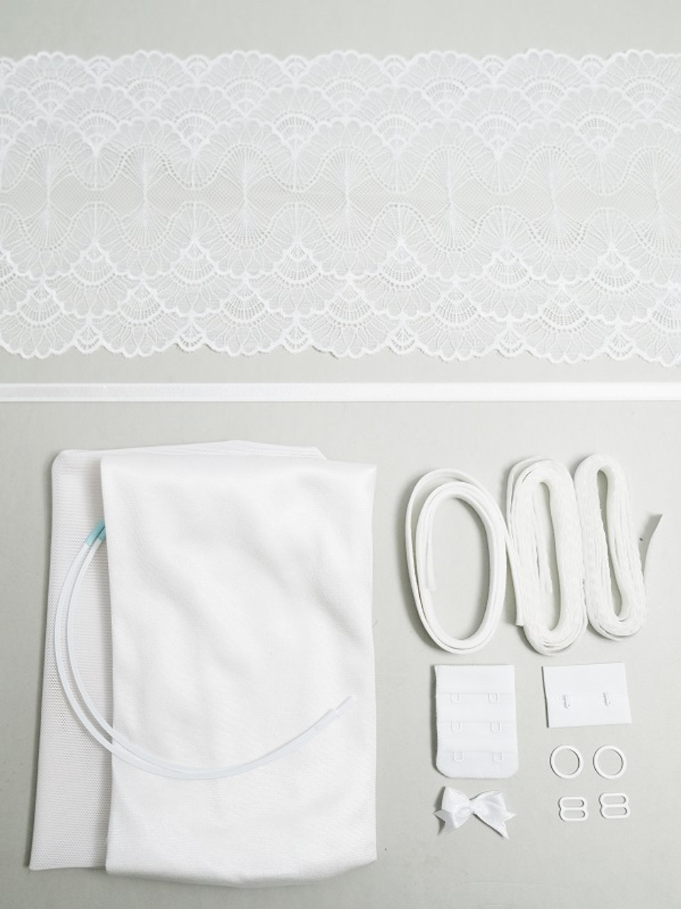 Back fabric - Powernet Elastane or Lycra, Cup fabrics, Lining fabric, Facing elastics , Shoulder strap elastic, Underwire casing & Underwires, Hook and eye tab, Lace (if applicable), Hardware - rings and slides, Bra motif.