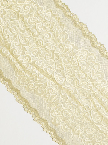 This lace is a medium-firm stretch lace with an incredible lace design in a unique moss green and ivory. Laces are sold by the metre unless stated otherwise. Kindly note that the laces have joins throughout the rolls, so if ordering larger quantites, you may have a join/s. Laces are non returnable as they are specifically cut for your order.