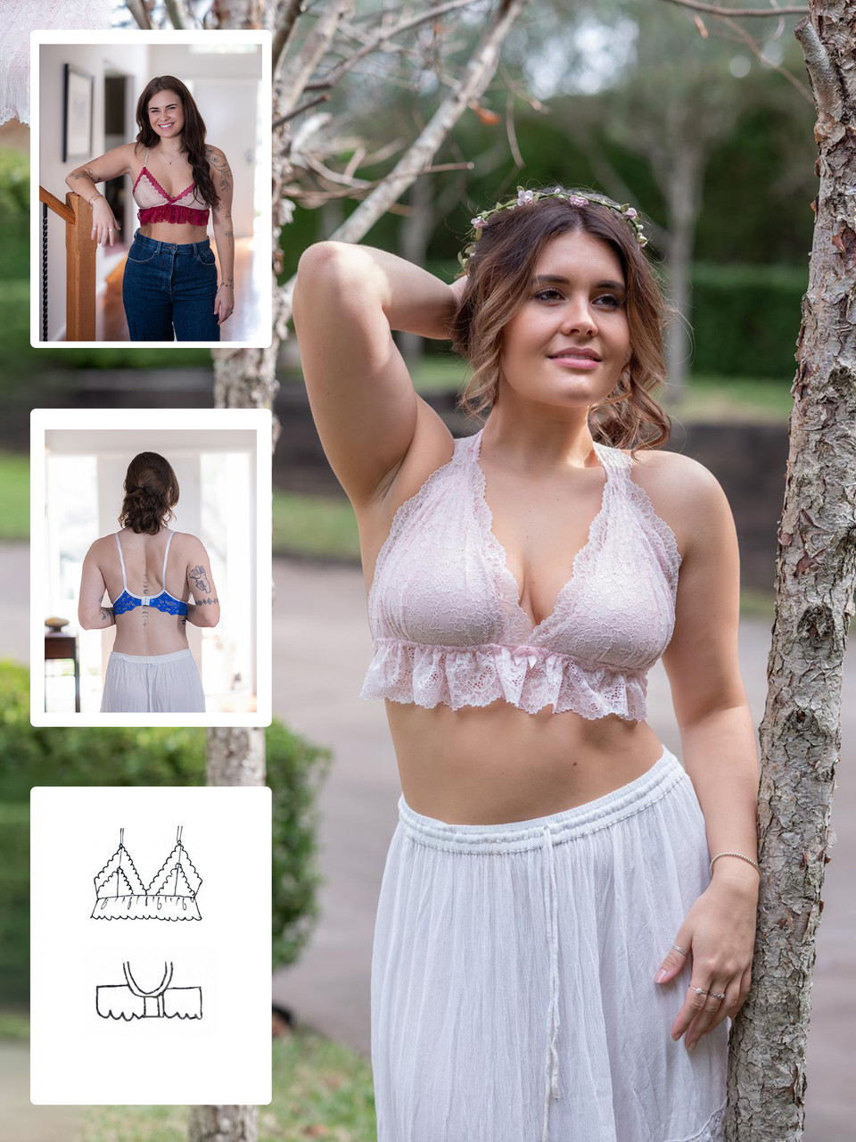 The Hannah bralette is a gathered frame, vertical seam bralette. It is a pretty and romantic bralette style with a double scallop lace edge design that looks amazing in different laces or fabrics.