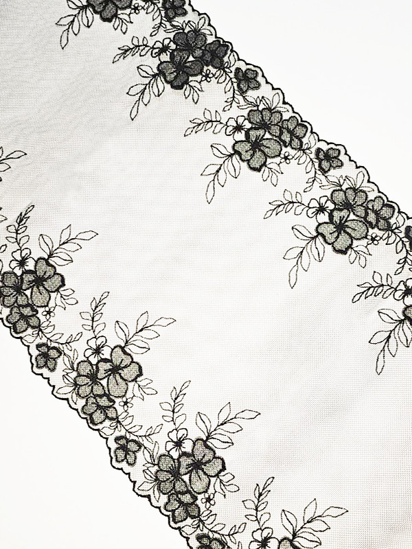 This bilateral lace has a heavy embroidered flower pattern over a sheer but strong mesh. Please note that the laces have joins throughout the rolls, so if ordering larger quantities, you may have a join/s. Laces are non returnable as they are specifically cut for your order.