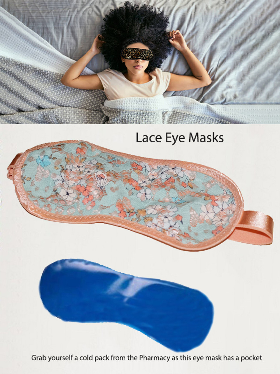They are designed and made so you can slide in a cold eye pack inside, to sooth puffy or tired eyes (gel packs are sold at most pharmacies). The lining is soft and silky Tricot, and the outer lace is also lined with the same fabric. The lace adds a uniquely feminine and pretty touch. These masks have an adjustable strap, so you can be sure they will fit you comfortably.