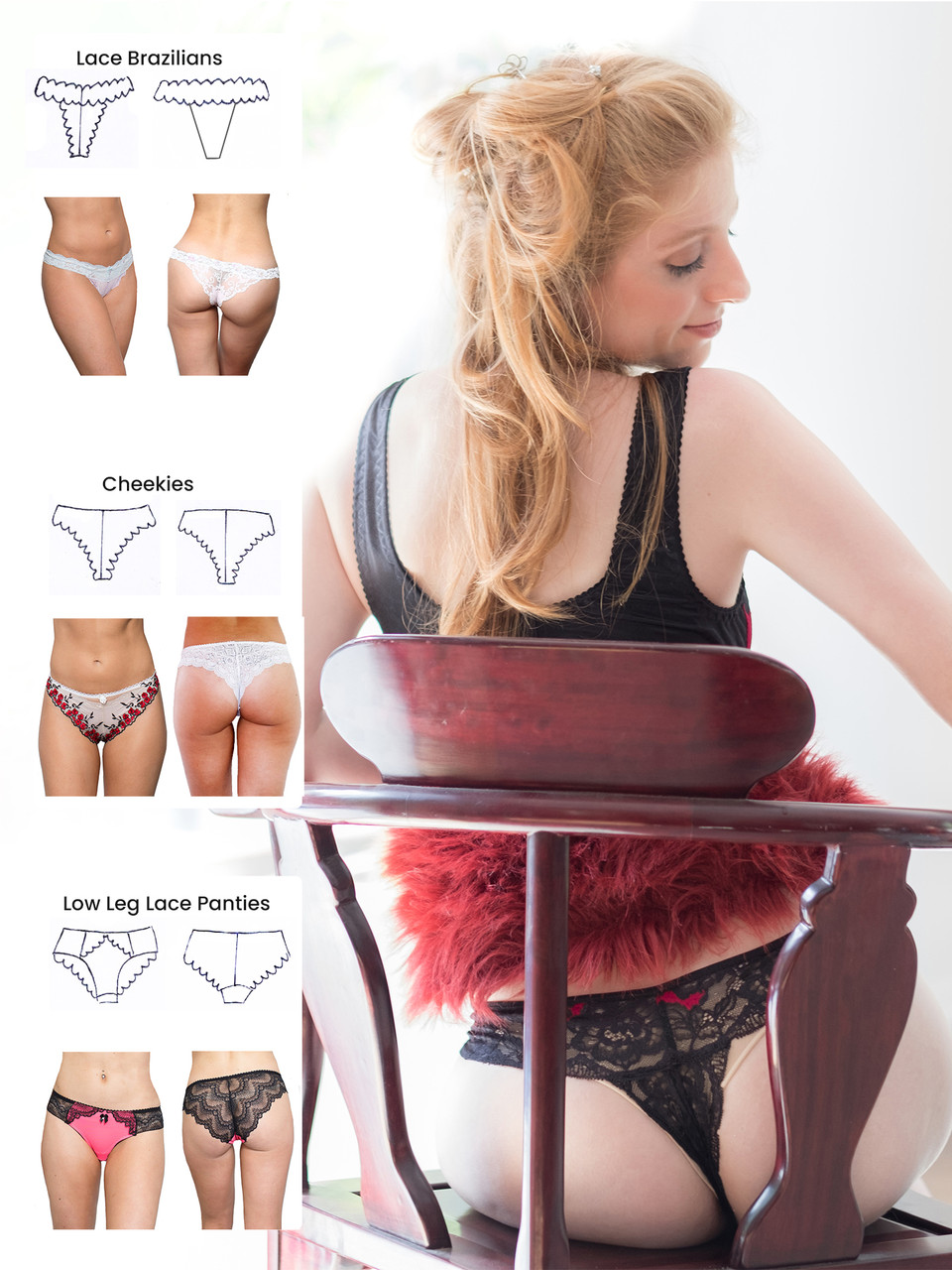 This pattern collection includes some of our fabulous lacey knickers Patterns. Make either the lace brazilians (string cut, fabric option or all lace options), Cheekies or Low Leg Lace Panties with this fabulous knickers pattern collection.
