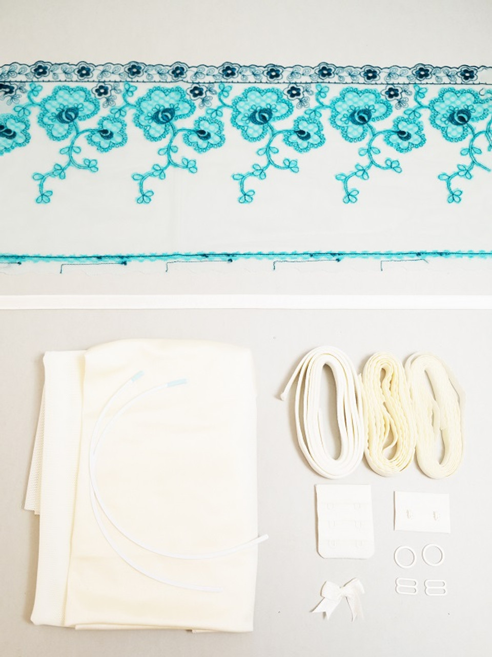 The lace provided is for the upper cups and centre front, so if you would like to make an all lace option, simply add more lace to your order using the dropdown menu. You can customise the kit to suit your taste. Powernet and cotton lining colours are limited, but cup fabric and add kits can be colour changed. Roses are for display purposes only.