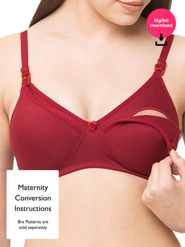 This is one A4 page explaining how to convert a bra into a maternity option. You will need baby cmbed cotton, folding elastic and 1 or 2 maternity clips to go with your existing bra making supplies. Construct your bra to before elastic and underwire casing insertion, then follow these intstructions to create your materninty cup/s. Insert the cup/s as instructed and finish the assembly of your favourite bra pattern.
