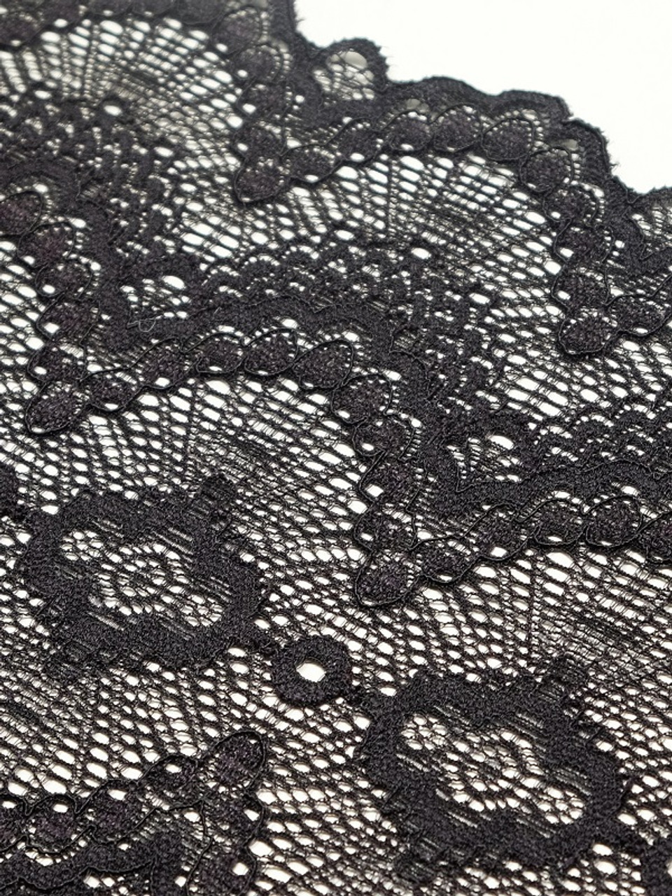 This lace is inticate in design and a light stretch. Stretch laces are used for bra making and lingerie construction and are sold by the metre and are non-returnable as they are cut for your order.