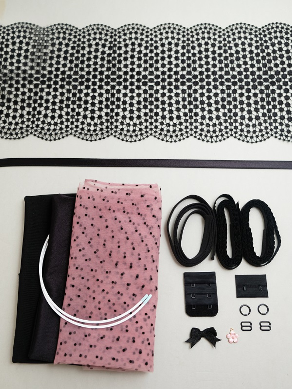 For mesh & lace kit (as pictured) - Powernet, polkadot bra mesh, rigid net lace, sheer nylon lining, facing elastics, shoulder strap elastic, underwire casing & underwires, hook and eye tab, hardware - rings and slides, boutique bra motif/charm.