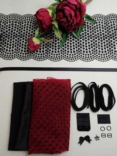 For mesh & lace kit (as pictured) - Powernet, polkadot bra mesh, rigid net lace, sheer nylon lining, facing elastics, shoulder strap elastic, underwire casing & underwires, hook and eye tab, hardware - rings and slides, boutique bra motif/charm.