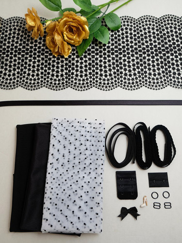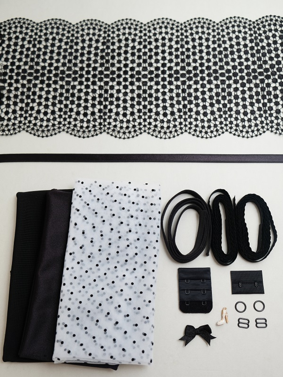 For mesh & lace kit (as pictured) - Powernet, polkadot bra mesh, rigid net lace, sheer nylon lining, facing elastics, shoulder strap elastic, underwire casing & underwires, hook and eye tab, hardware - rings and slides, boutique bra motif/charm.