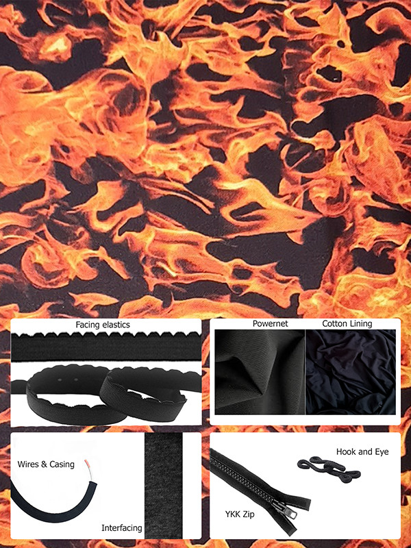 Back fabric - Powernet, cotton woven cup fabric, baby combed cotton jersey lining fabric, band facing elastic, underarm/shoulder/bust facing elastic, underwire casing, wires, YKK front opening zip (12cm for sizes 28 - 36 and 17cm for sizes 38 - 54), interfacing strip, hook and eye.