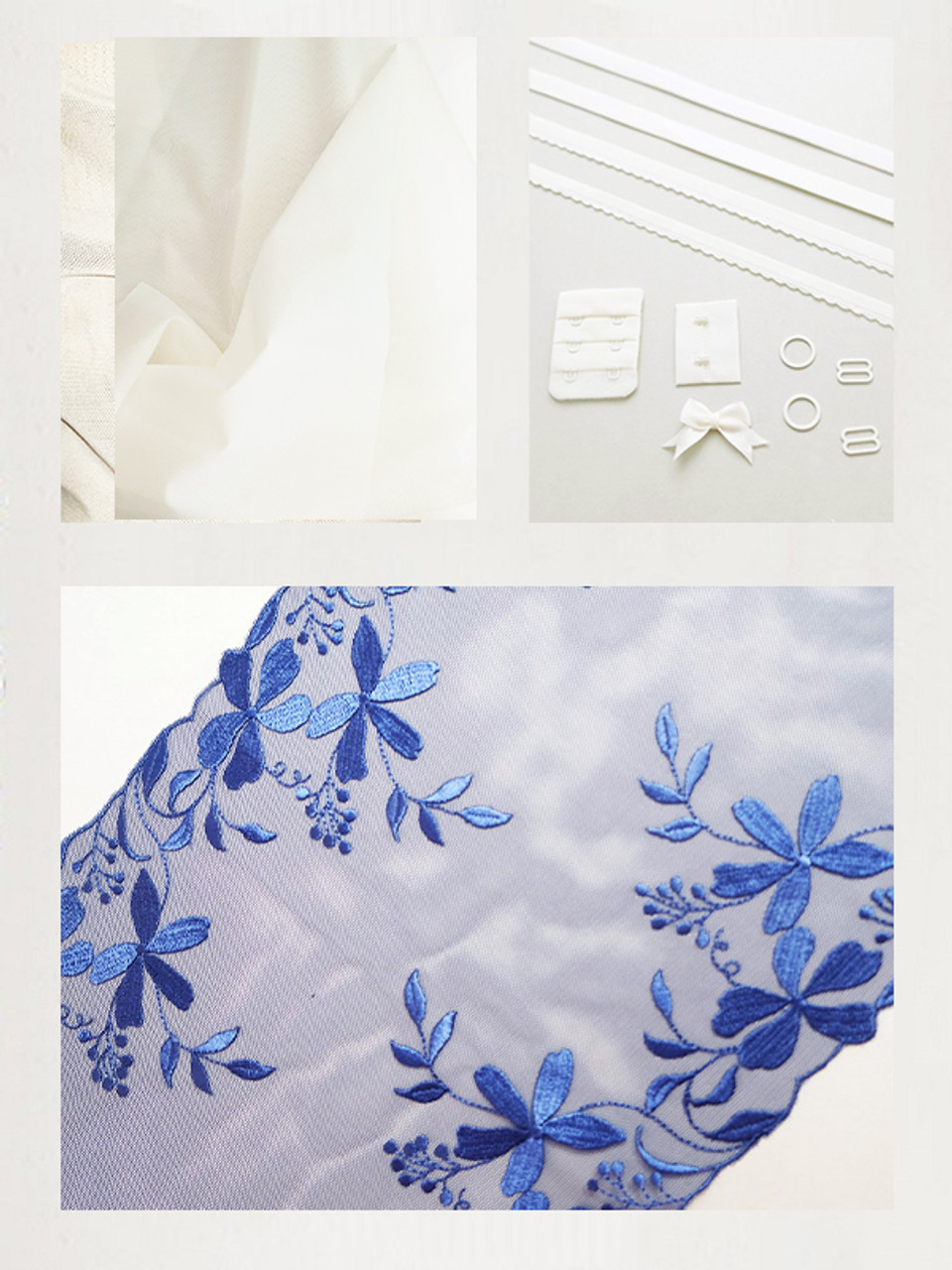 Back fabric, cup fabrics, elastics and strapping, underwire casing, hook and Eye Tabs or Tape, lace (if applicable), underwires, rings and slides, motif. There are some slightly different components depending on what pattern you select.
