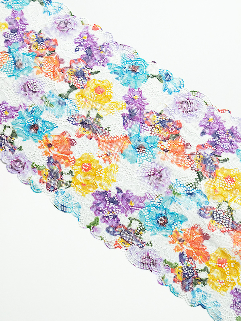 This lace is a firm stretch bilateral lace. The print is pretty in bright florals. Laces are sold by the metre unless stated otherwise. Kindly note that the laces have joins throughout the rolls, so if ordering larger quantites, you may have a join/s. Laces are non returnable as they are specifically cut for your order.