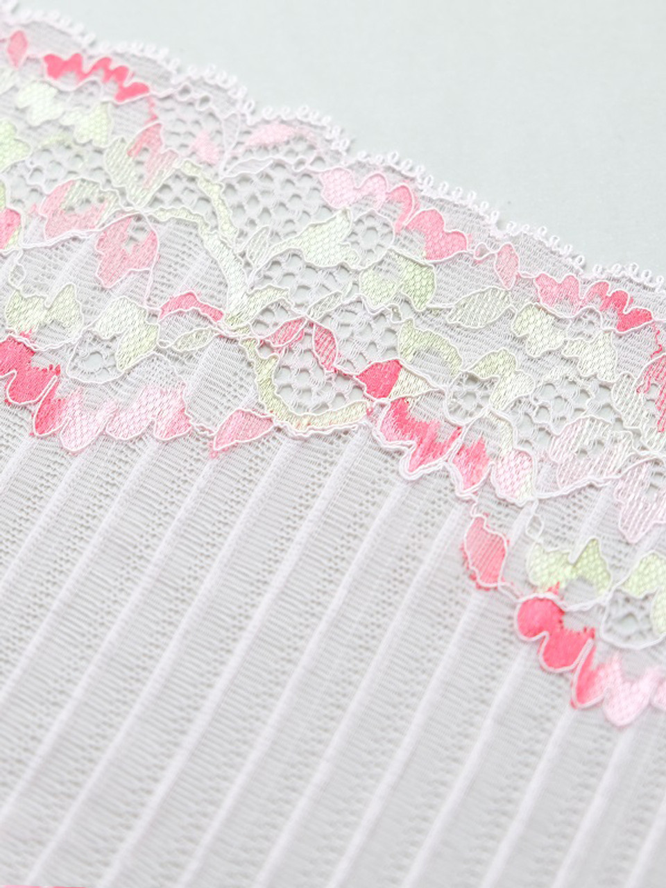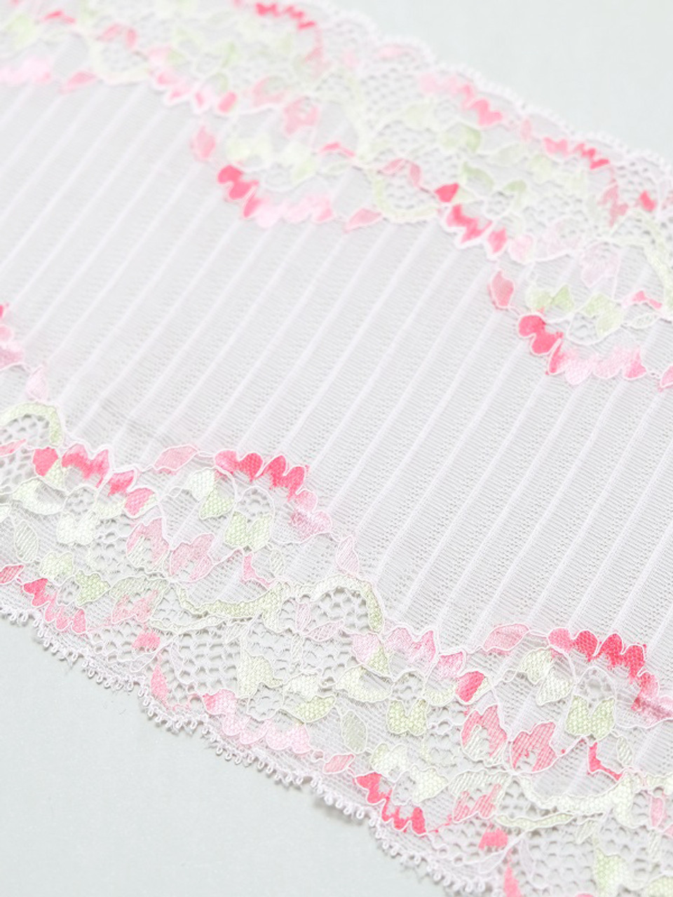 This lace is a light-medium weight stretch lace with a unique striped lace pattern in the centre and mint and pink floral pattern on the edges. Laces are sold by the metre unless stated otherwise. Kindly note that the laces have joins throughout the rolls, so if ordering larger quantites, you may have a join/s. Laces are non returnable as they are specifically cut for your order.