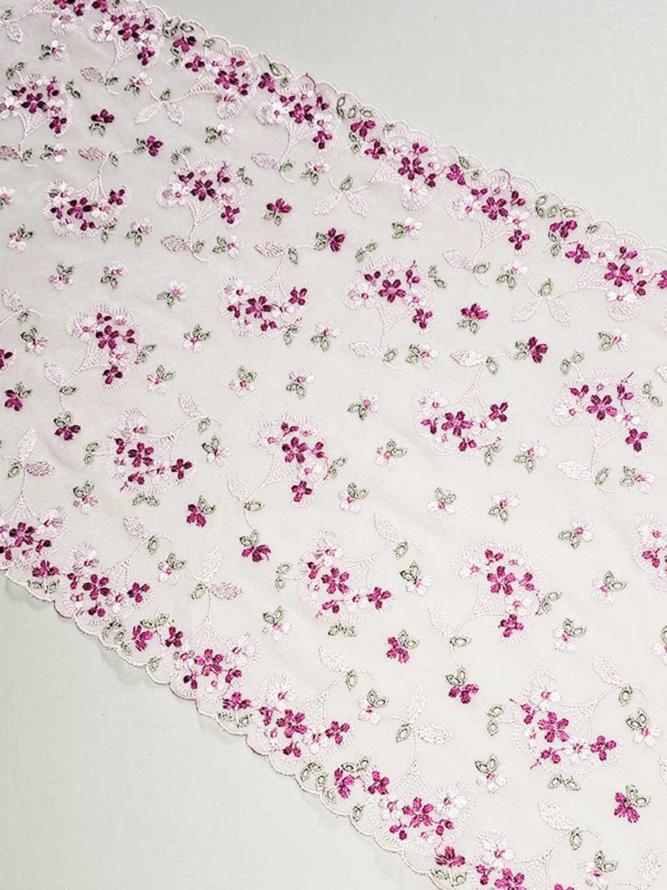This beautiful embroidered lace has a pretty pink design. It is wide and supportive, perfect for bra, lingerie and camisole making. Laces are sold by the metre unless stated otherwise. Kindly note that the laces have joins throughout the rolls, so if ordering larger quantites, you may have a join/s. Laces are non returnable as they are specifically cut for your order.
