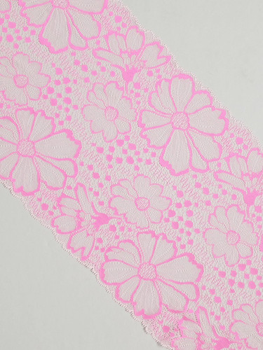 This lace is a medium-firm stretch lace in a contrasting pale and vibrant pink with bilateral edges. Laces are sold by the metre unless stated otherwise. Kindly note that the laces have joins throughout the rolls, so if ordering larger quantites, you may have a join/s. Laces are non returnable as they are specifically cut for your order.
