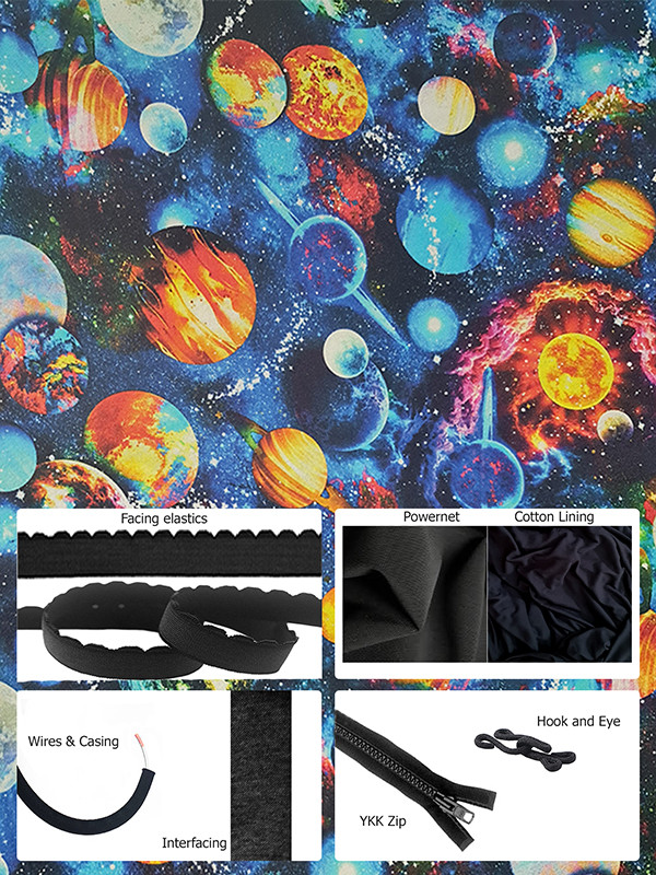 Back fabric - Powernet, cotton woven cup fabric, baby combed cotton jersey lining fabric, band facing elastic, underarm/shoulder/bust facing elastic, underwire casing, wires, YKK front opening zip (12cm for sizes 28 - 36 and 17cm for sizes 38 - 54), interfacing strip, hook and eye.