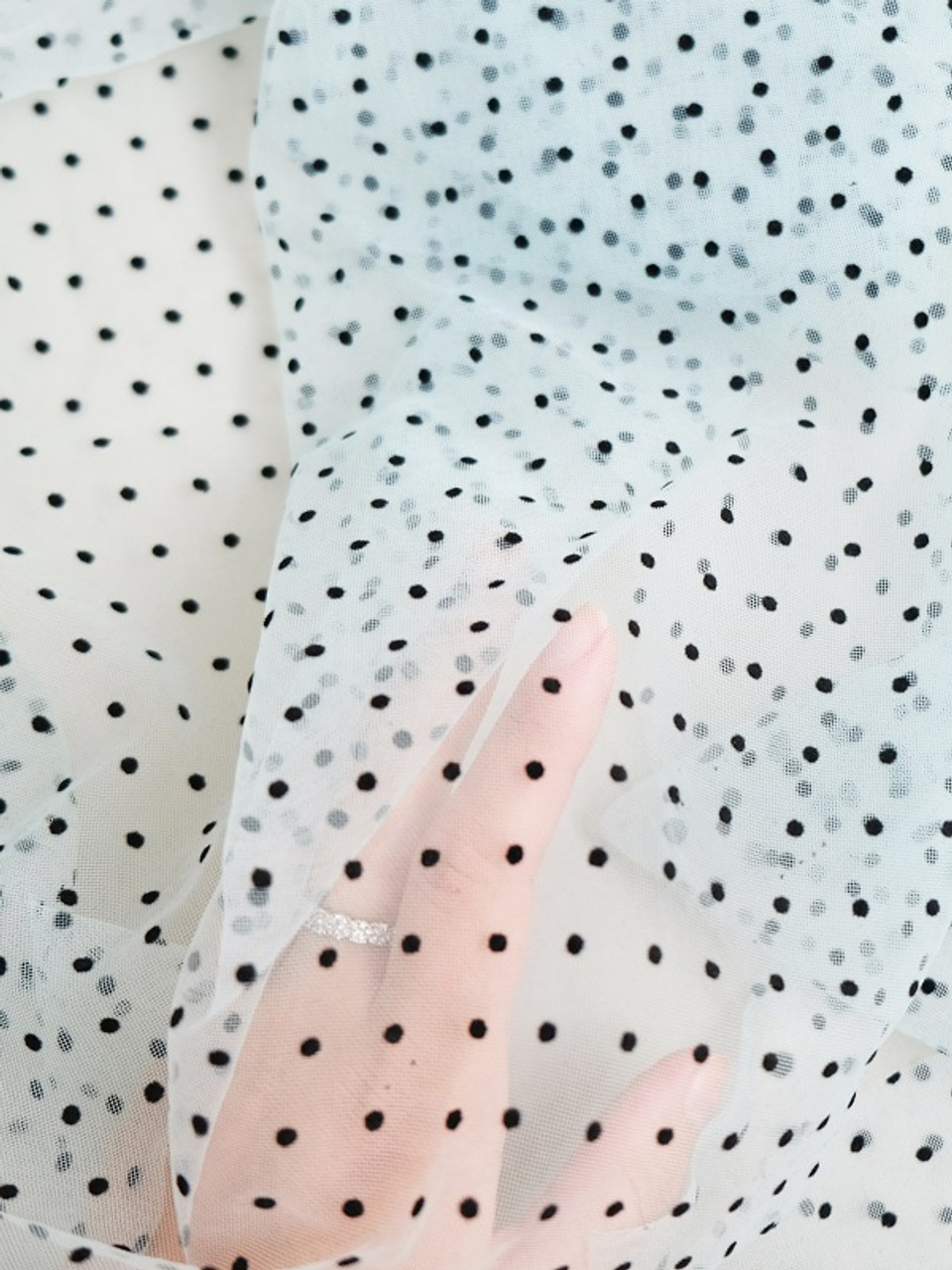 A drapeable woven flocked fabric with one way medium stretch. This mesh tulle is perfect for lingerie and loungewear. The flock may rop small black fibres on occasion, but will stop after washing. To deepen the colour line your lingerie with a solid similar shade. Hand was recommended. These fabrics are sold by the metre.