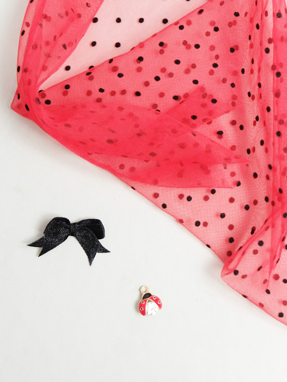For all mesh option - Powernet, polkadot bra mesh, sheer nylon lining, folding elastic for upper cup trim, facing elastics, shoulder strap elastic, underwire casing & underwires, hook and eye tab, hardware - rings and slides, boutique bra motif/charm.