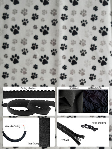 Back fabric - Powernet, cotton woven cup fabric, baby combed cotton jersey lining fabric, band facing elastic, underarm/shoulder/bust facing elastic, underwire casing, wires, YKK front opening zip (12cm for sizes 28 - 36 and 17cm for sizes 38 - 54), interfacing strip, hook and eye.