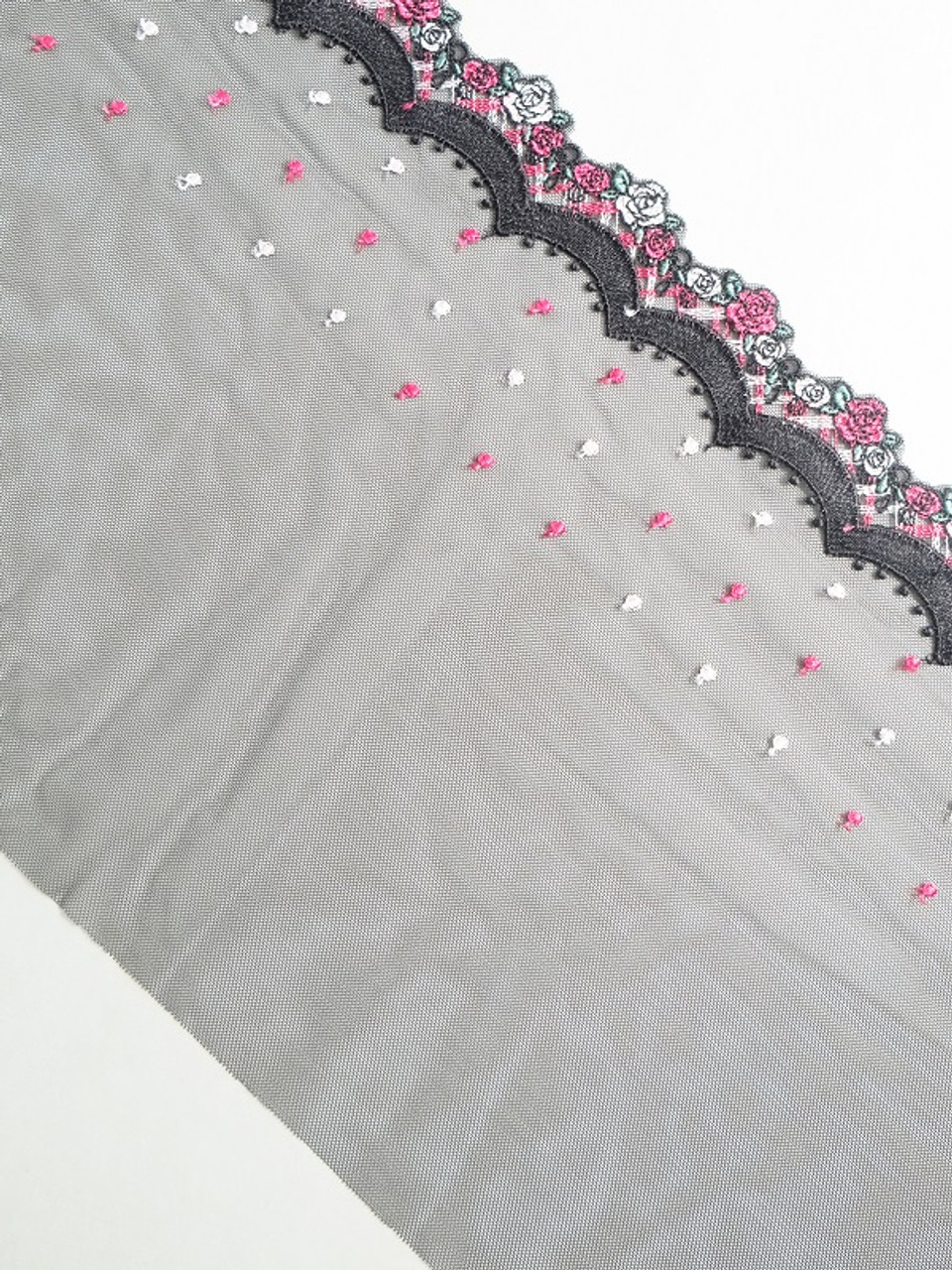 Embroidered mesh with a gorgeous rose design on the lace edge. The majority of this lace is mesh, and it is a strong and supportive lace, perfect for bra, lingerie and camisole making. As it is a wide profile it is suitable for large busts. Laces are sold by the metre unless stated otherwise. Kindly note that the laces have joins throughout the rolls, so if ordering larger quantites, you may have a join/s. Laces are non returnable as they are specifically cut for your order.