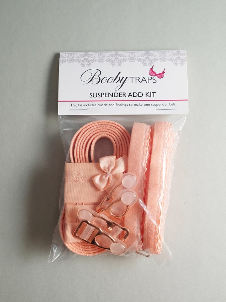 Suspender add kits contain elastics and hardware, essentially everything you need to make a suspender belt except for the fabrics. You can customise them to suit your needs and style. You will receive a packaged kit with the following: bra strap elastic, facing or folding elastic, hook & eye tab, 4 slides, 4 suspender clips and 1 motif. The quantity of each item depends on the size selected.