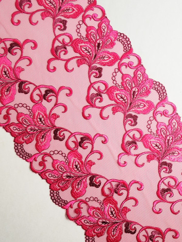 This unilateral lace is a bright cerise pink embroidered non stretch option. Laces are sold by the metre unless stated otherwise. Kindly note that the laces have joins throughout the rolls, so if ordering larger quantites, you may have a join/s. Laces are non returnable as they are specifically cut for your order.