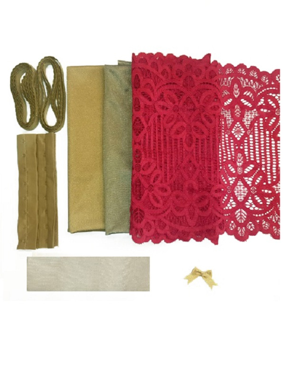 Your kit will contain cup fabrics, lining fabrics, elastics, centre front stanbiliser, hook and eye tape and a motif.