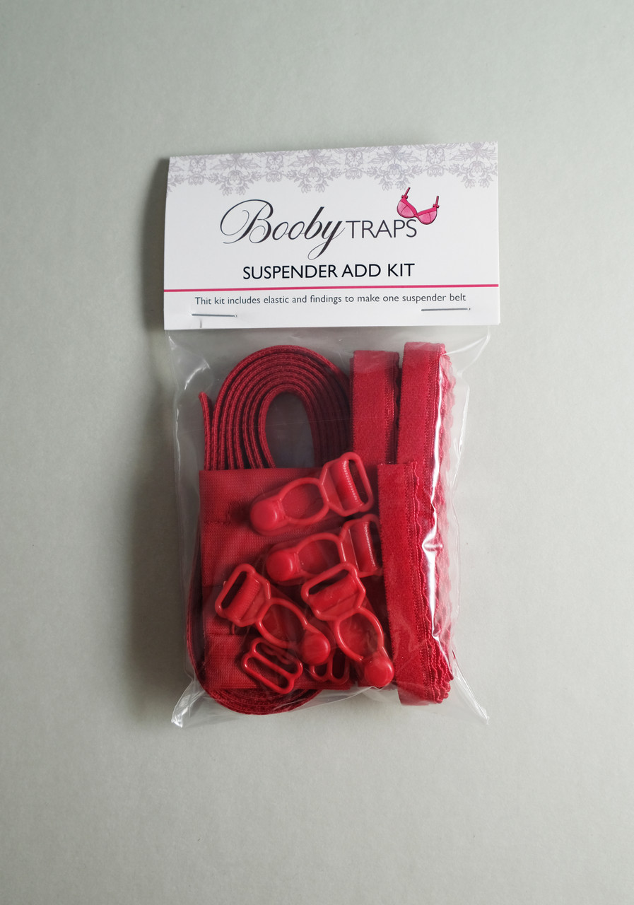 Suspender add kits contain elastics and hardware, essentially everything you need to make a suspender belt except for the fabrics. You can customise them to suit your needs and style. You will receive a packaged kit with the following: bra strap elastic, facing or folding elastic, hook & eye tab, 4 slides, 4 suspender clips and 1 motif. The quantity of each item depends on the size selected.