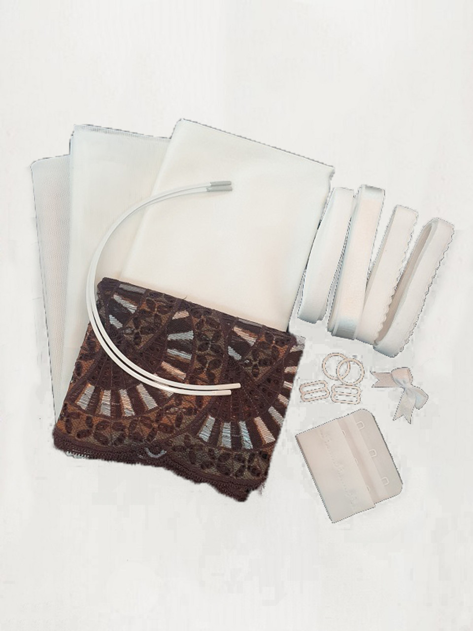 Back fabric - Powernet, Elastane or Lycra, Cup fabrics, Lining fabric, Facing elastics , Shoulder strap elastic, Underwire casing & Underwires, Hook and eye tab, Lace (if applicable), Hardware - rings and slides, Bra motif.