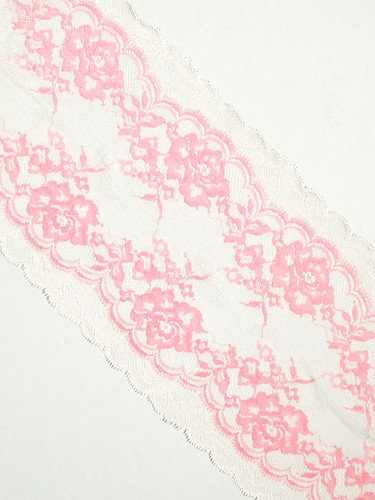 This lace is a light stretch lace with a delicate pale nude base and coral embroidery. It is extremely wide and suitable for most patterns due to its width. Laces are sold by the metre unless stated otherwise. Kindly note that the laces have joins throughout the rolls, so if ordering larger quantites, you may have a join/s. Laces are non returnable as they are specifically cut for your order.
