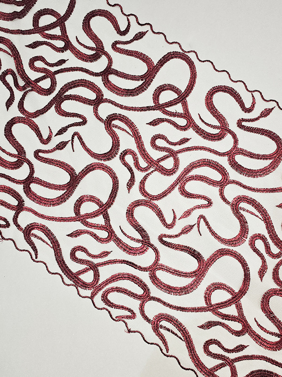 This bilateral lace has an amazing embroidered snake design in a deep red. Please note that the laces have joins throughout the rolls, so if ordering larger quantites, you may have a join/s. Laces are non returnable as they are specifically cut for your order.