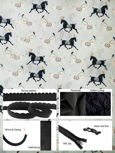 Back fabric - Powernet, cotton woven cup fabric, baby combed cotton jersey lining fabric, band facing elastic, underarm/shoulder/bust facing elastic, underwire casing, wires, YKK front opening zip (12cm for sizes 28 - 36 and 17cm for sizes 38 - 54), interfacing strip, hook and eye.