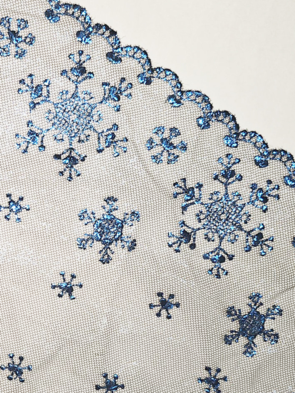 This lace is divine. It has a sparkling blue snowflake embroidered pattern over a strong but fine black mesh for a sexy sheer finish. Laces are sold by the metre unless stated otherwise. Kindly note that the laces have joins throughout the rolls, so if ordering larger quantites, you may have a join/s. Laces are non returnable as they are specifically cut for your order.