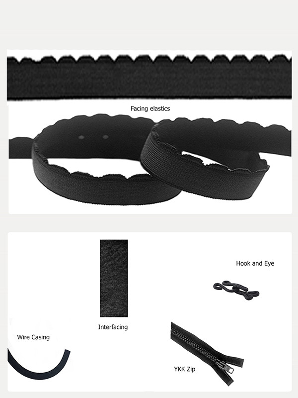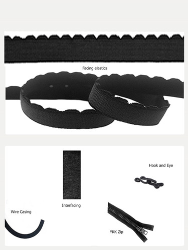 Back fabric - Band facing elastic, underarm/shoulder/bust facing elastic, underwire casing, YKK front opening zip (12cm for sizes 28 - 36 and 17cm for sizes 38 - 54), interfacing strip, hook and eye.