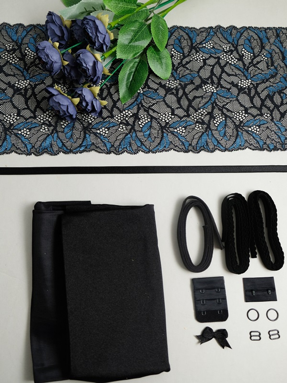 The lace provided is for the upper cups and centre front, so if you would like to make an all lace option, simply add more lace to your order using the dropdown menu. You can customise the kit to suit your taste. Powernet and cotton lining colours are limited, but cup fabric and add kits can be colour changed. Roses are for display purposes only.