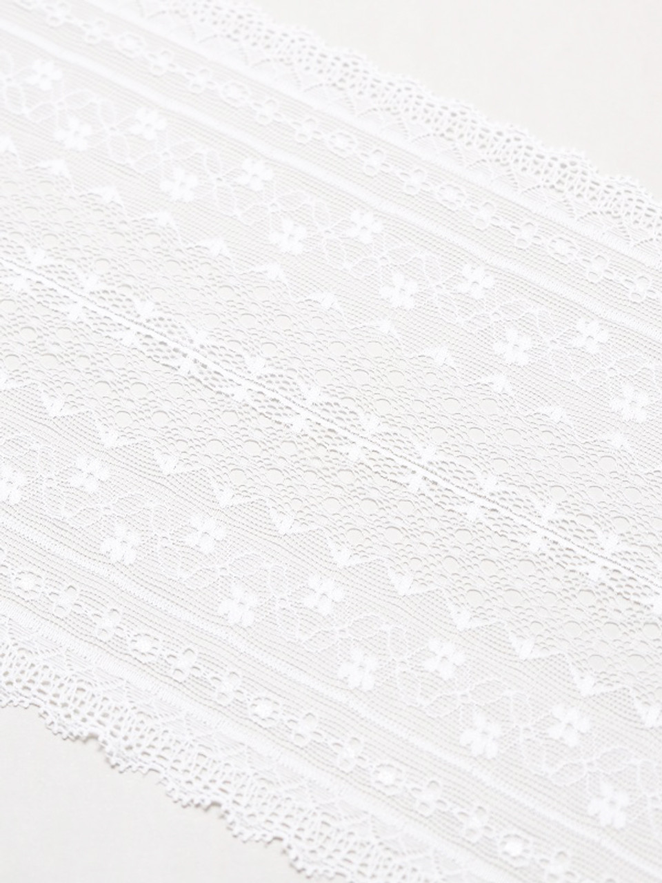 This lace is lightweight stretch, double scallop edge lace with an incredibly intricate floral design. Laces are sold by the metre unless stated otherwise. Kindly note that the laces have joins throughout the rolls, so if ordering larger quantites, you may have a join/s. Laces are non returnable as they are specifically cut for your order.